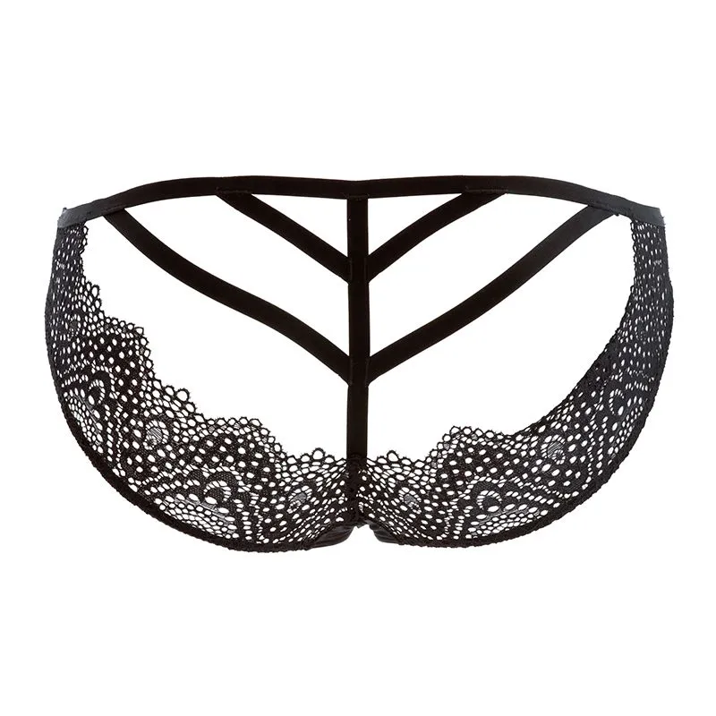 Cette culotte fine habille les hanches et les fesses d’un jeu de lanières. Sur l’avant, un jeu de découpe souligne les hanches et offre un effet ajouré des plus séduisants. Sur le dos, ses lanières fines soulignent les courbes et invitent le regard. Ses pans de dentelle subliment les fesses et mettent en lumière leur galbe naturel. A la fois couvrante et voluptueuse, cette culotte met en valeur les fesses avec élégance.