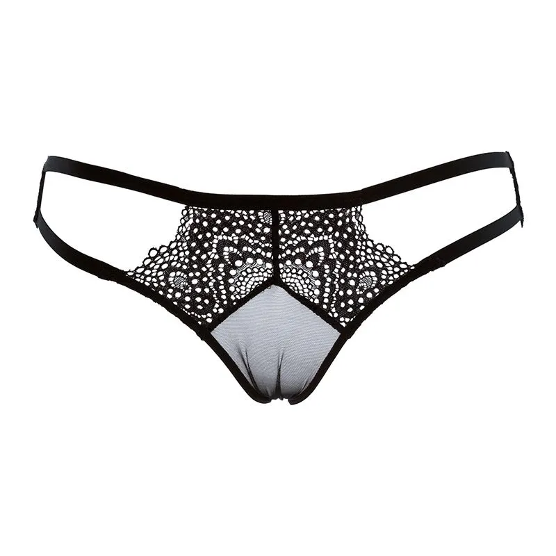 Dans un mélange de tulle transparent et de dentelle, cette culotte souligne les courbes et les dévoile à la fois. Le pubis est habillé d’une résille transparente bordée de dentelle symétrique qui orne l’entrejambe. Sur le dos, les fesses sont soulignées par des pans de dentelle qui contrastent avec la peau laissée nue. Mélangeant la transparence, une dentelle aérienne et une coupe ajourée, cette culotte sublime les fesses avec élégance.
