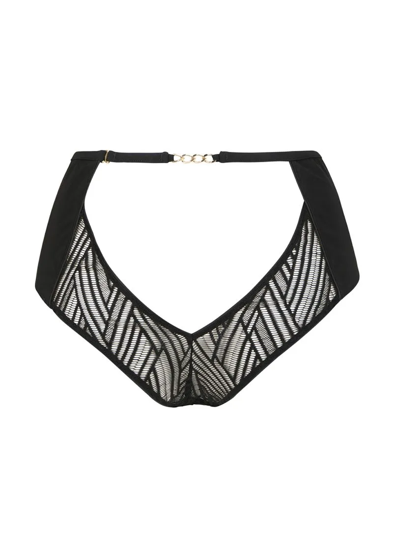 Cette culotte habille la peau d’une maille opaque et d’une dentelle graphique transparente. Son jeu de matière apporte une un effet structuré sur l’avant, soulignant les hanches. Les dos est encore plus dévoilé avec sa découpe sensuelle. Un bijou chaînette doré vient se loger au creux des reins et invite le regard.