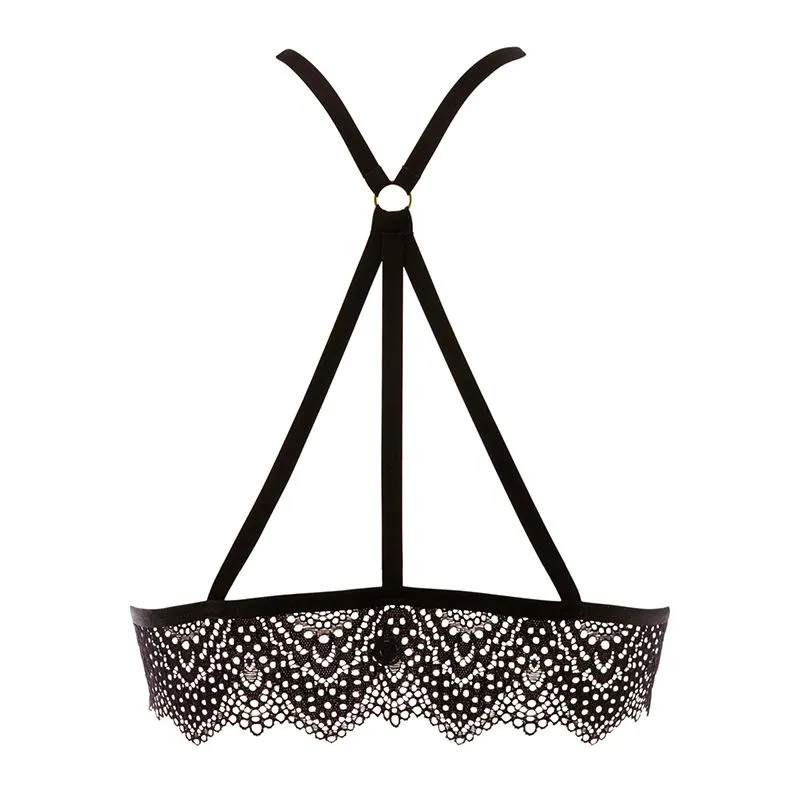 Ce soutien-gorge a une coupe triangle, sans armature, il habille le sein d’une matière souple et fluide. Ses bretelles fines se rejoignent autour du cou et laissent les épaules nues. Son dos sans agrafage dévoile une bande de dentelle large et un jeu de lanières fines. Il s’ouvre sur l’entre-seins grâce à une fine attache magnétique dorée. Laissant le décolleté très dégagé, son ouverture aimantée invite au jeu.