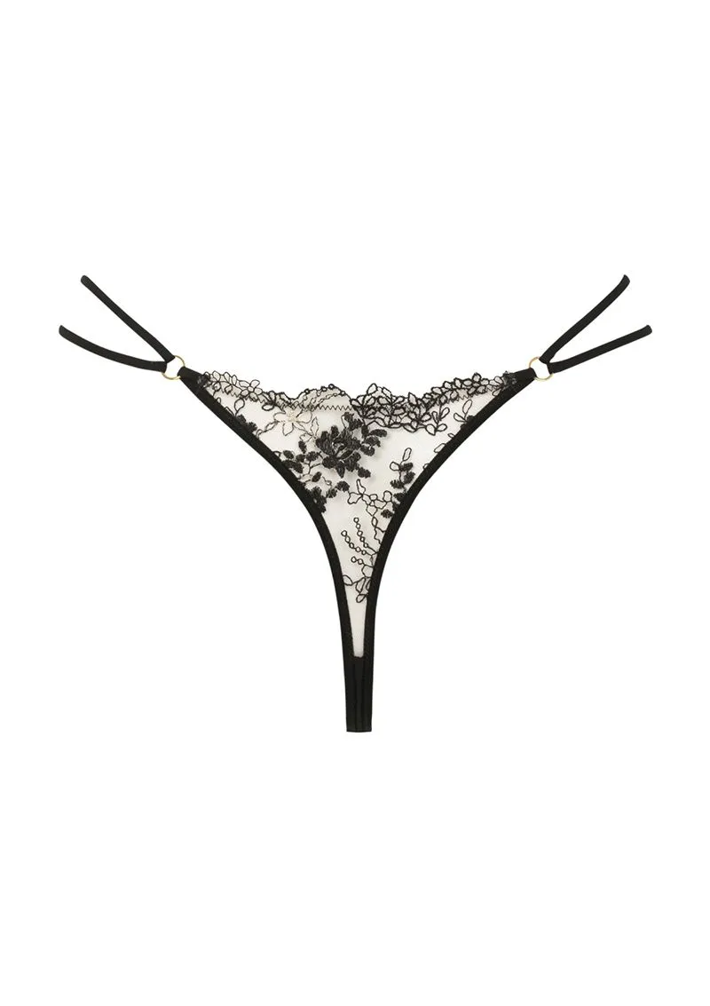Tout en tulle transparent, ce string dévoile la peau. Une fine broderie en fils noir et or la pare, ils dessinent sur le pubis et les fesses un délicat motif de fleurs. Délicat et échancré, ce string souligne les courbes en finesse. Sa coupe effilée le rend invisible sous les vêtements et son entrejambe couverte de coton en fait une pièce de lingerie qui se porte en toute occasion.