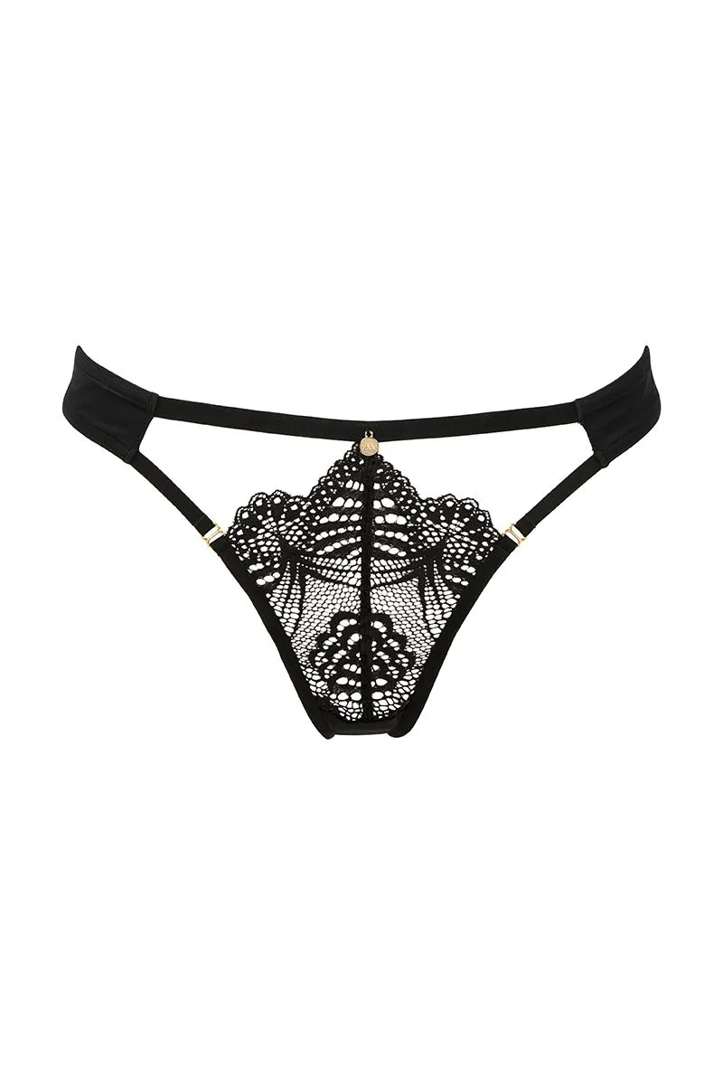 Dans un mélange de dentelle graphique et de maille opaque, cette culotte joue avec la transparence. Sa coupe ajourée sur l’avant laisse la peau nue. Sa dentelle fine habille le pubis et les fesses d’un motif graphique. Son jeu de laçage souligne le creux des reins. De petites attachent en acier doré l’habillent et accentuent son effet bijou. Tout en noir et doré, cette culotte fine sublime les fesses.
