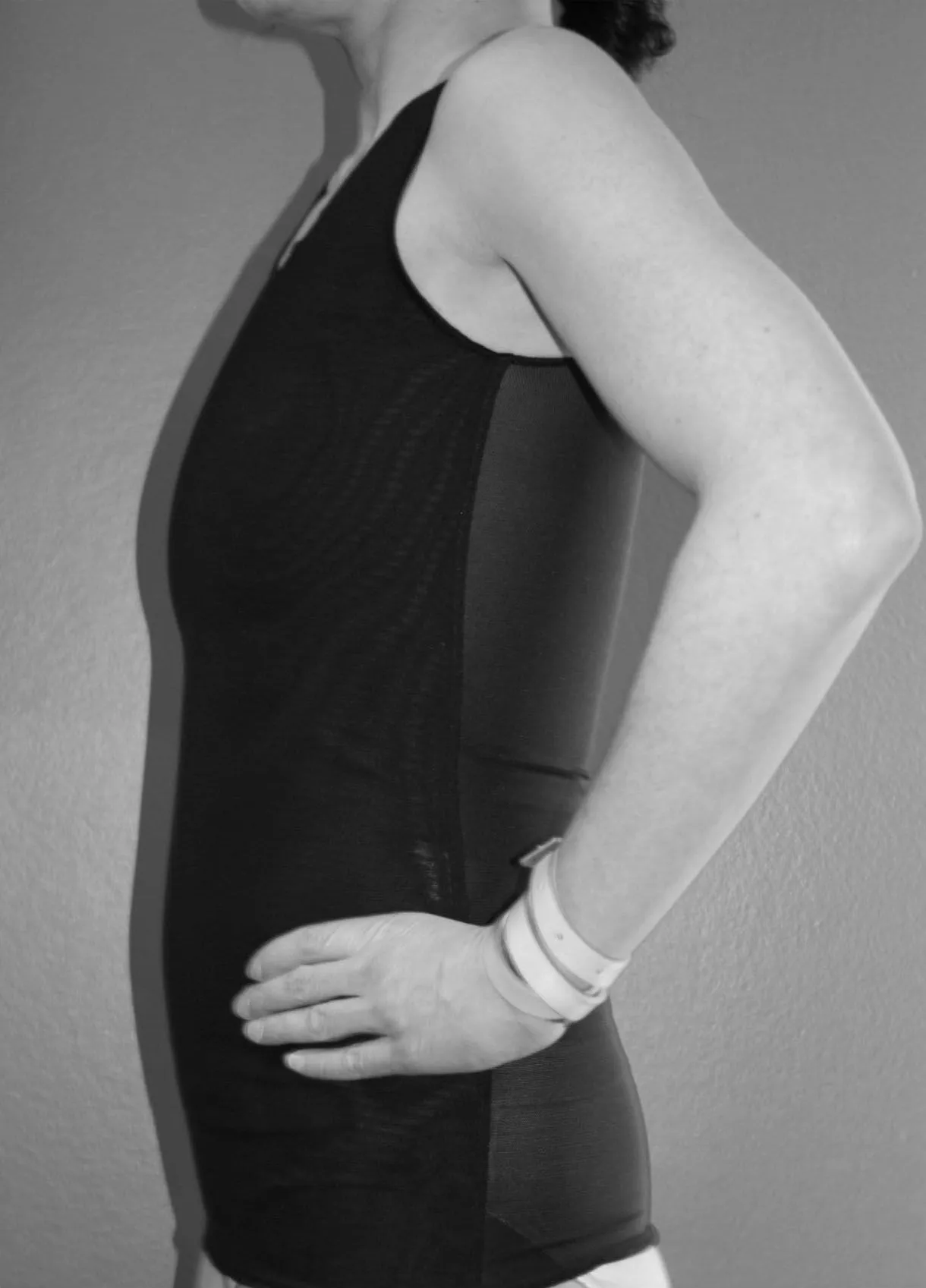 La partie de devant est renforcée par une double épaisseur qui écrase les seins et ainsi élimine toutes “rondeurs” ou volume et donne une ligne beaucoup plus plate sur la poitrine.