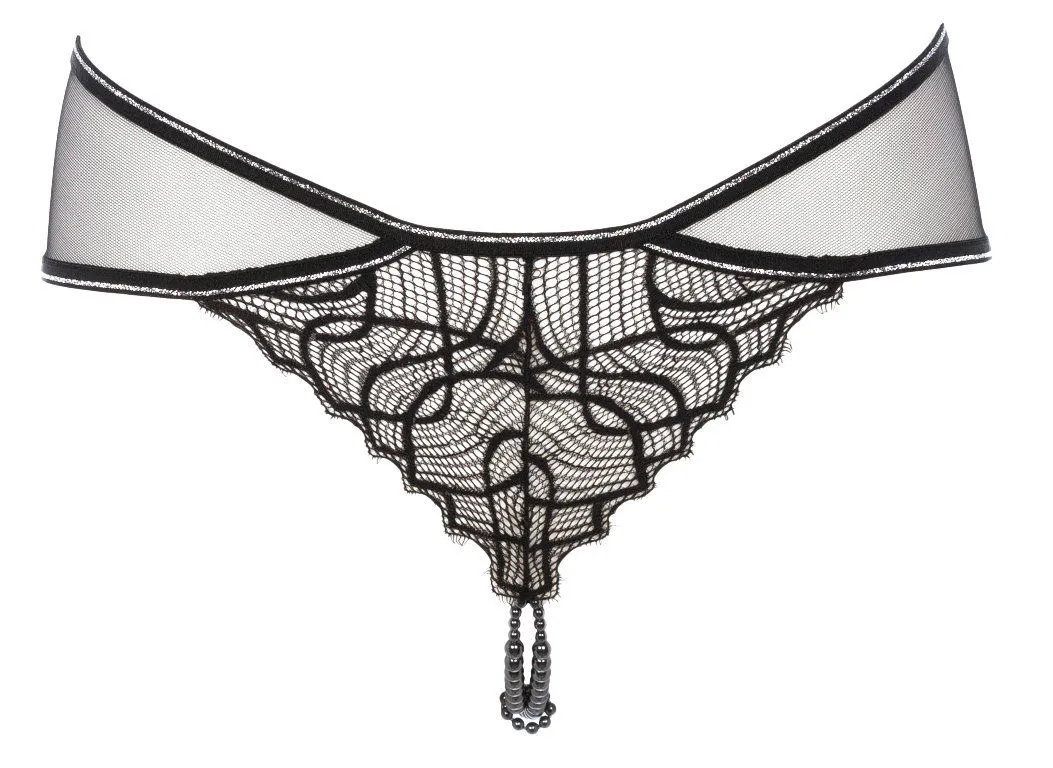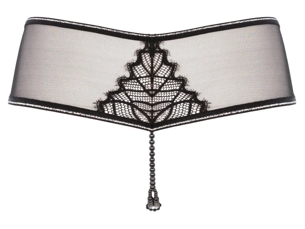 Une bande de tulle transparent habille les hanches tandis que le pubis et le haut des fesses sont sublimés par une dentelle graphique.