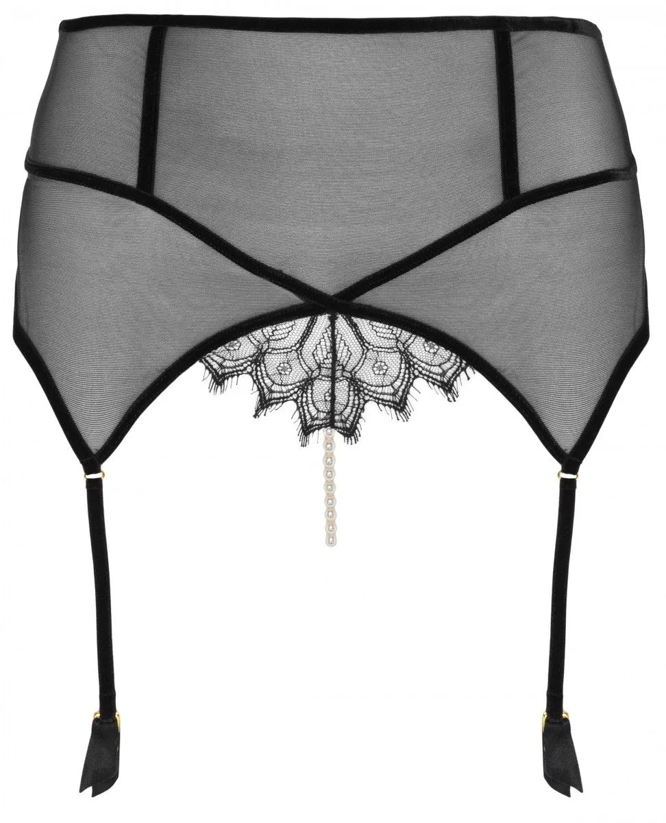 Ce porte-jarretelles est réalisé en dentelle de calais, tulle élastique et velours.