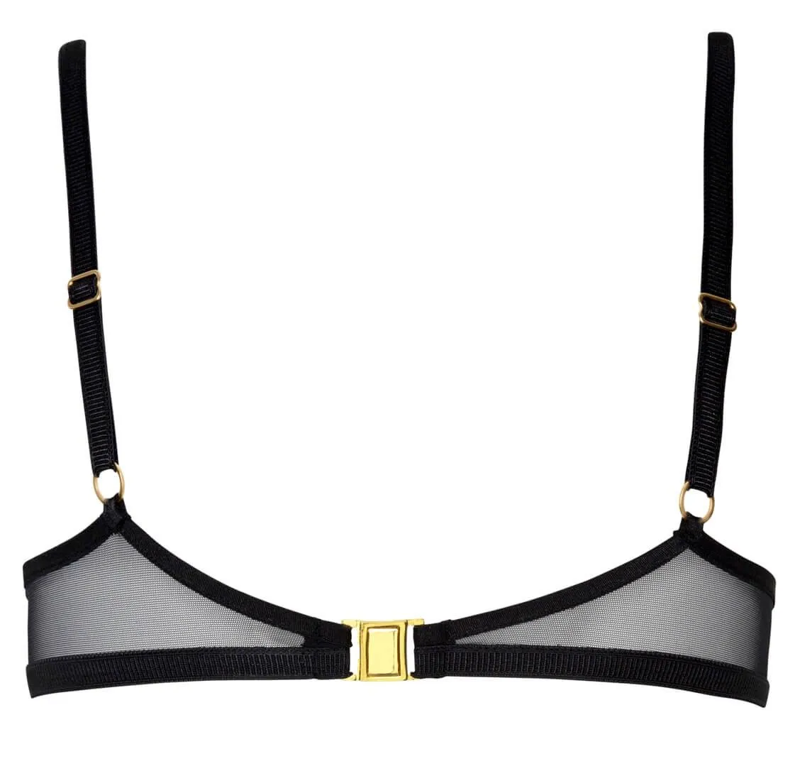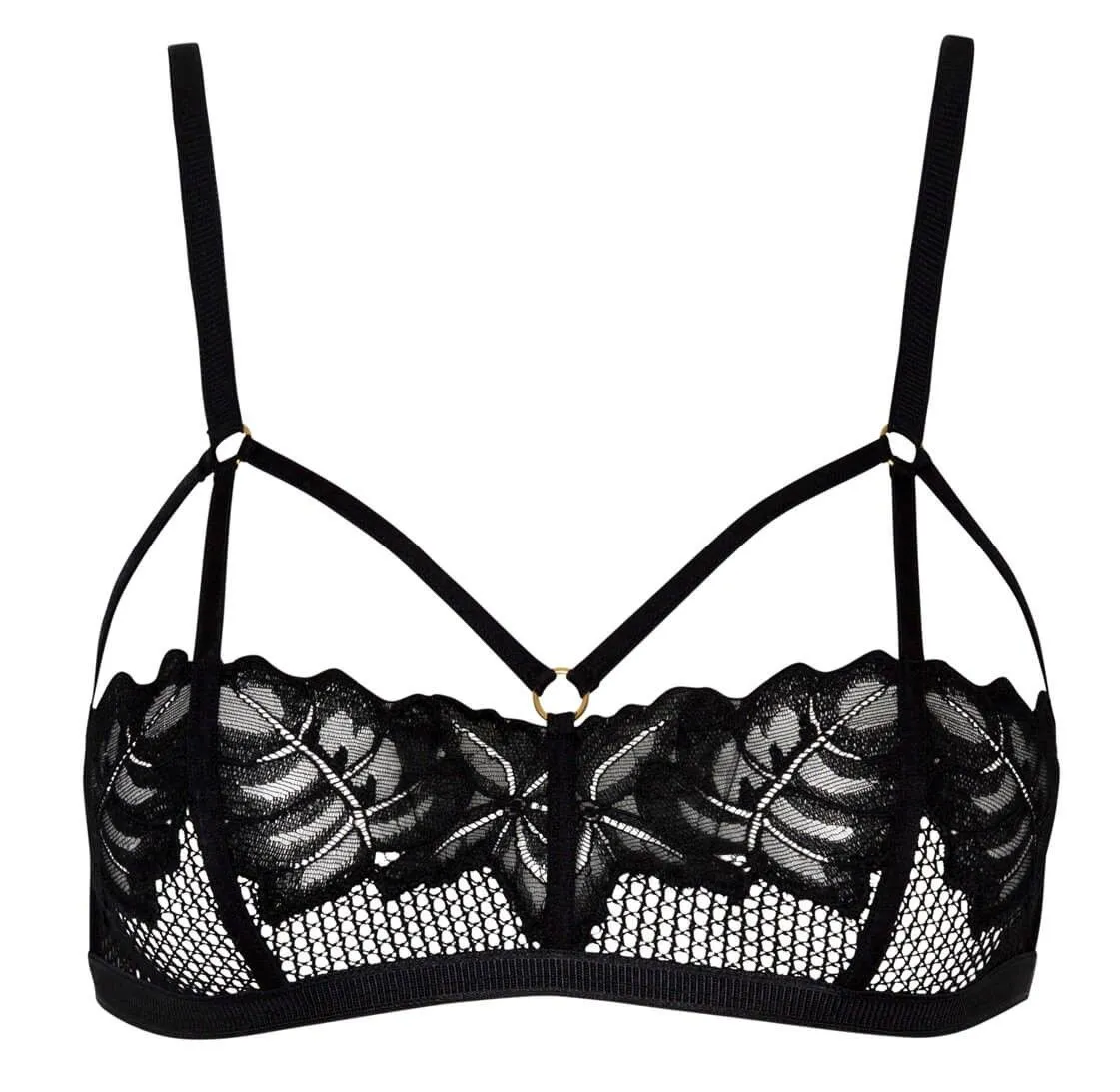 La poitrine est soutenue par les bonnets en résille, délimités par la dentelle, tandis que le haut du sein est mis en valeur par un jeu de lanières.
