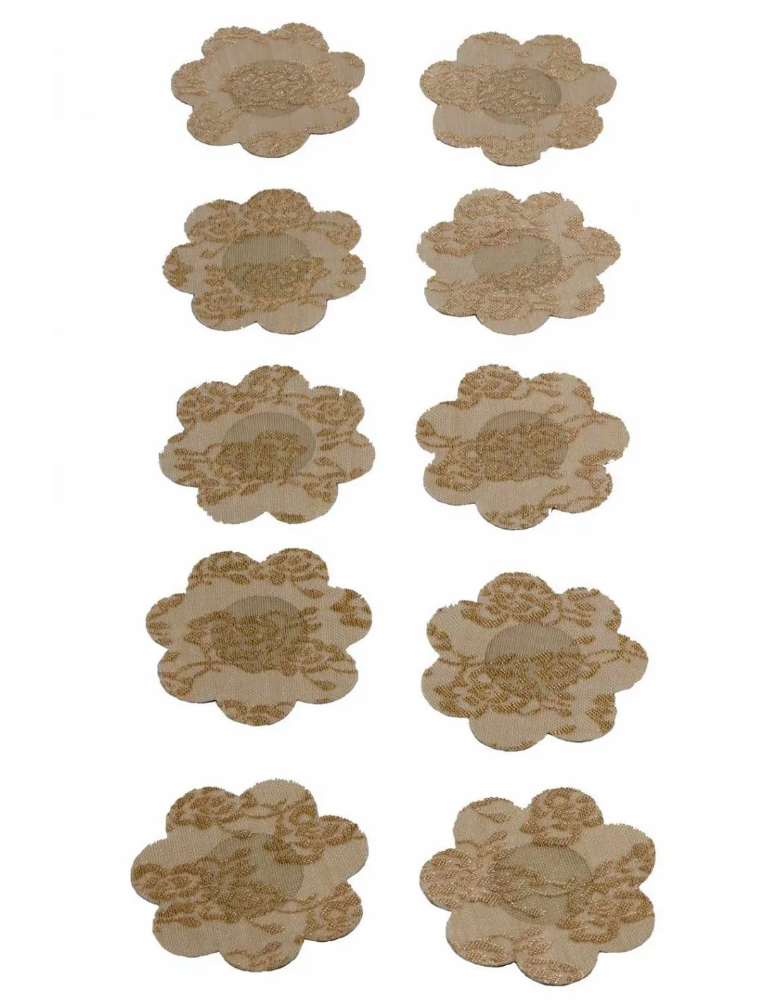 Ces cache-tétons ornent le sein d’une fleur de couleur beige. Son centre plus opaque est fait pour masquer le tétons. Ils se collent sur une peau propre et sèche, une crème hydratante pourra altérer leur effet collant. Ils sont repositionnables et peuvent être réutilisés. Une pochette contient 5 paire de nippies.
