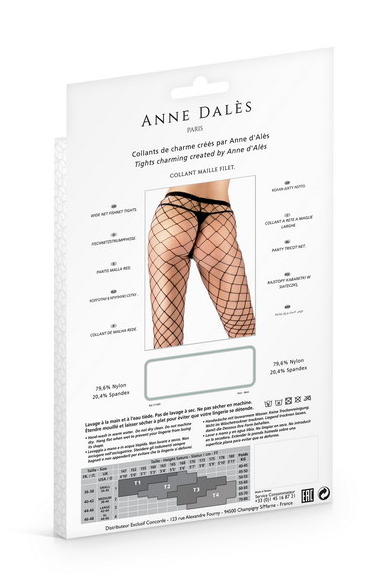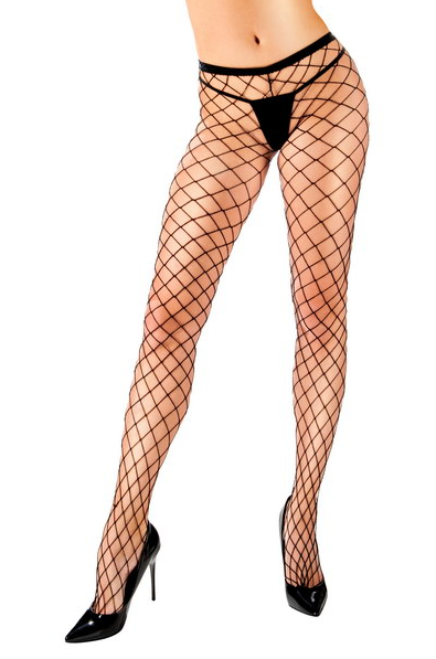 Ce collant en résille large, très élastique, se termine à la taille par une large bande noire.