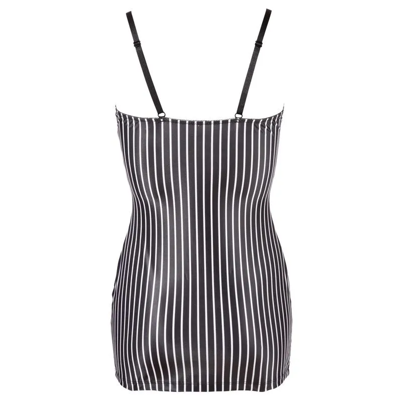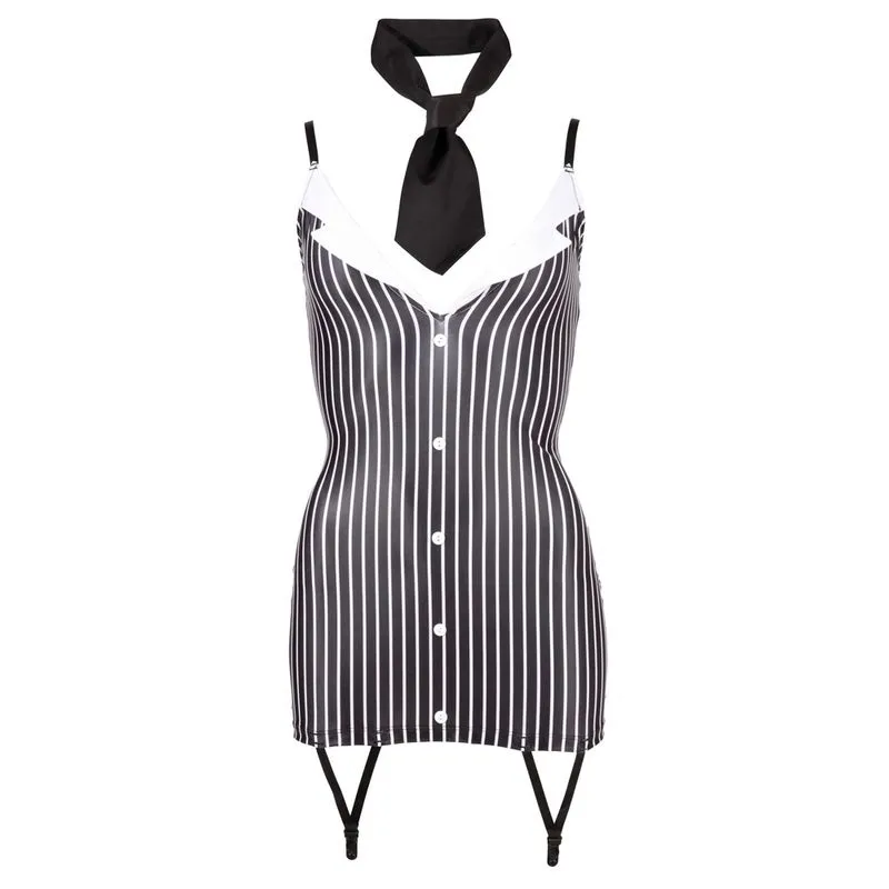 Cette tenues est composée d’une mini robe avec porte-jarretelles intégrés effet costard et d’une cravate.