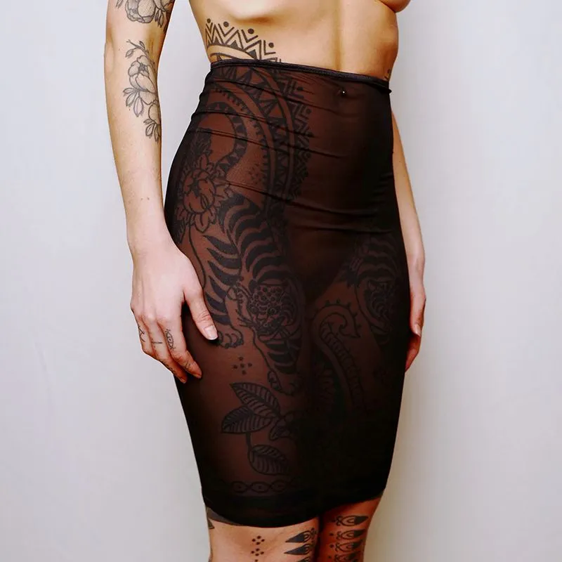 Intégralement transparente, cette jupe souligne les courbes du corps.