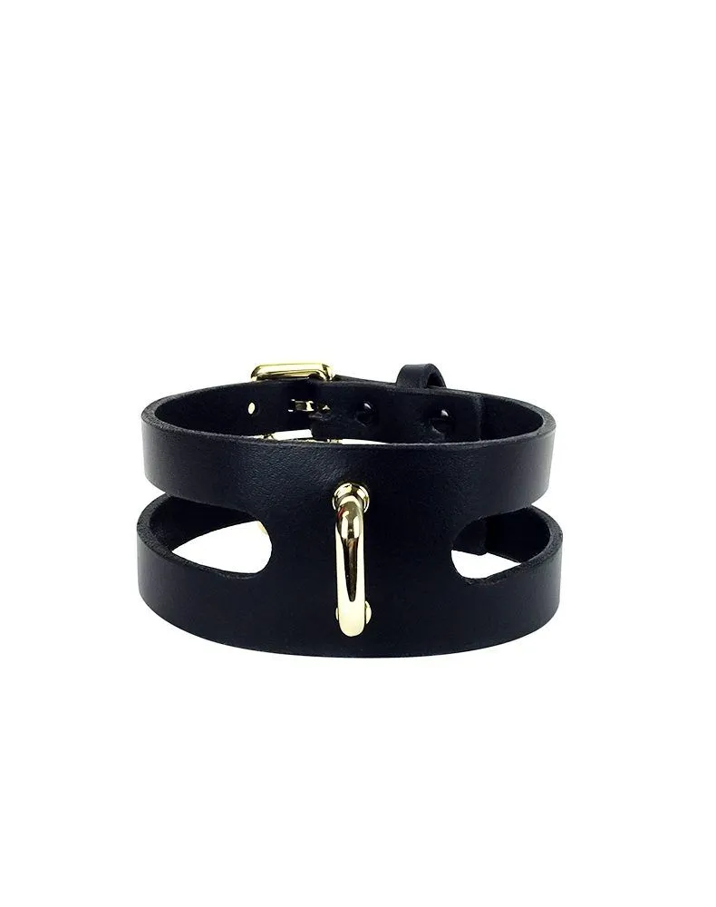 Choker double lanières en cuir à tannage végétal surmonté d’un passant en plaquage or 24 carats.
