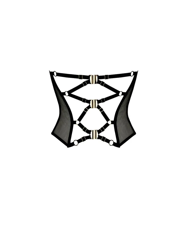 Dans un délicat mélange de dentelle florale, de tulle transparent et de soie, cette guêpière habille le corps et le déshabille à la fois. Son tulle transparent sous la poitrine accentue l’effet plongeant du décolleté. Ses attaches en acier plaquées or 24 carats contrastent avec son tissu transparent noir. Sa dentelle fine dessine un motif de fleurs sur les seins. Portée avec ses porte-jarretelles, elle devient pièce de séduction ultime dans l’intimité, tandis que sans, elle devient bustier à porter en soirée.