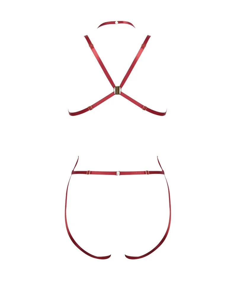 Cette tenue tout en jeu de lanières vient souligner et caresser les parties du corps les plus sensuelles.
