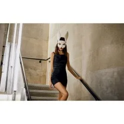 Cette robe souligne la poitrine avec son col bénitier qui met en valeur le décolleté. Ses bretelles fines et son dos échancré laissent les épaules nues. Ni trop longue, ni trop courte, elle souligne la taille et allonge la jambe. Le cou est habillé d’un fin harnais en lanières élastiques ornées d’attaches plaquées or. Son harnais sublime la peau et apporte une touche provocante à cette robe très sensuelle.