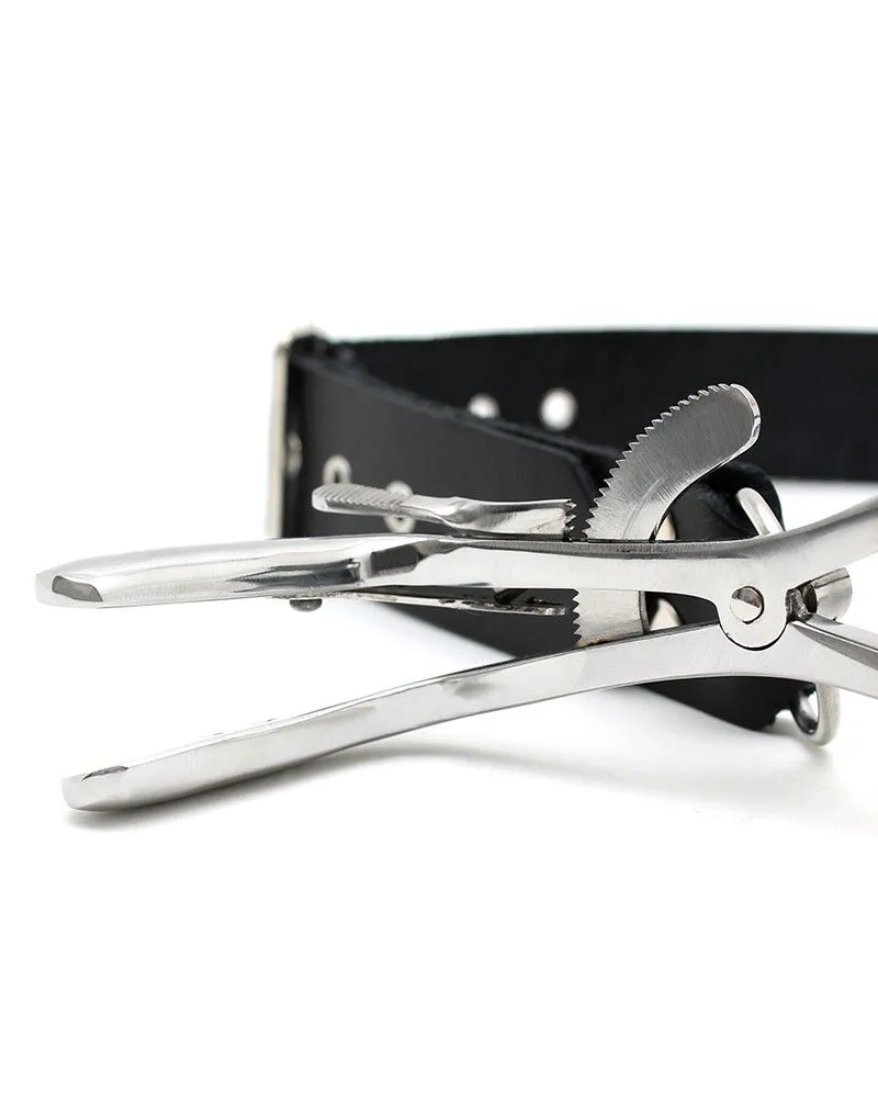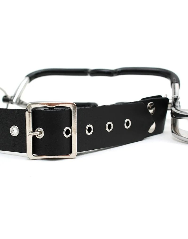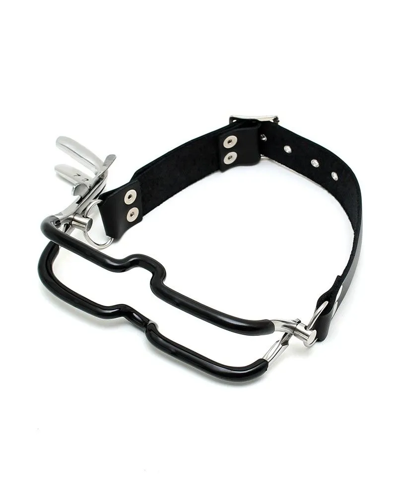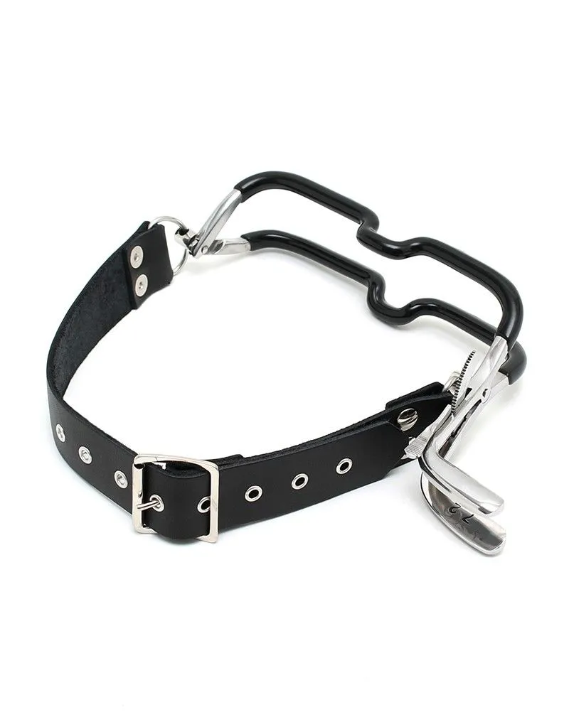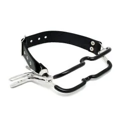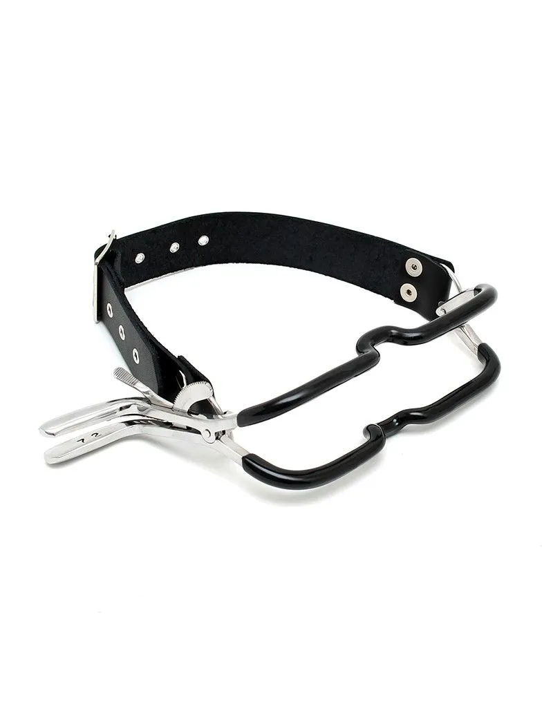 L’écarteur buccal est directement tiré de l’univers du fétichisme médical. Se déclinant sous plusieurs formes, celui-ci met en scène un environnement et un matériel spécifique qui permet de jouer à s’ausculter dans l’intimité d’une relation soignant/patient. L’écarteur de bouche permet de forcer l’ouverture de cette dernière et de garder la mâchoire en position ouverte. Le réglage de l’écarteur buccal se fait grâce à une partie crantée sur le côté que l’on peut bloquer afin d’empêcher qu’il ne se desserre. Le porteur ne peut alors pas refermer la bouche, contrôler les sons qu’il produit, ni contrôler sa production de salive.
