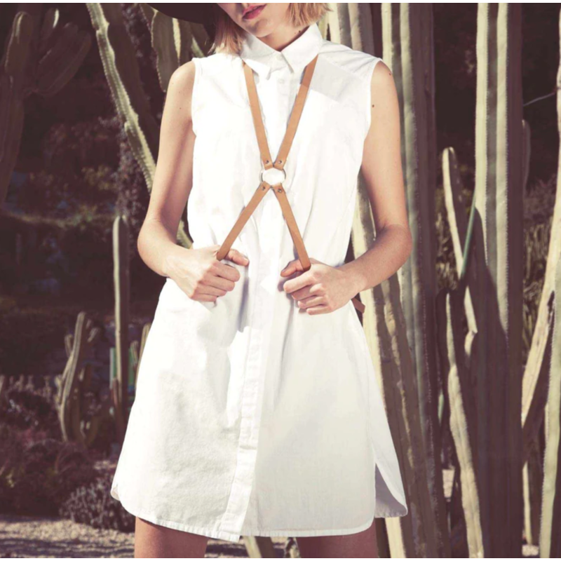 En cuir vegan certifié PETA sa couleur camel viendra adoucir le côté bondage du harnais et sera une couleur parfaite pour le printems et l’été.
