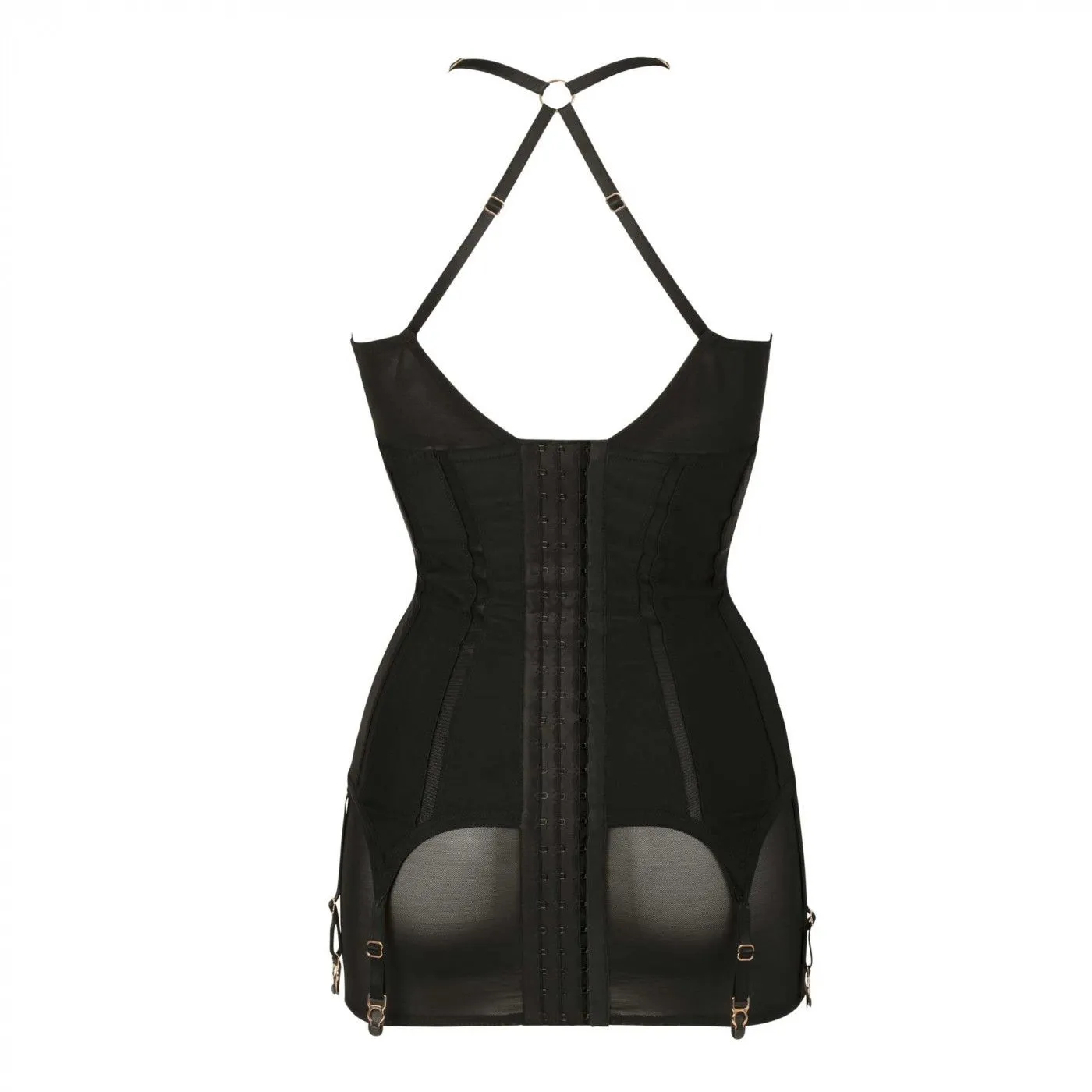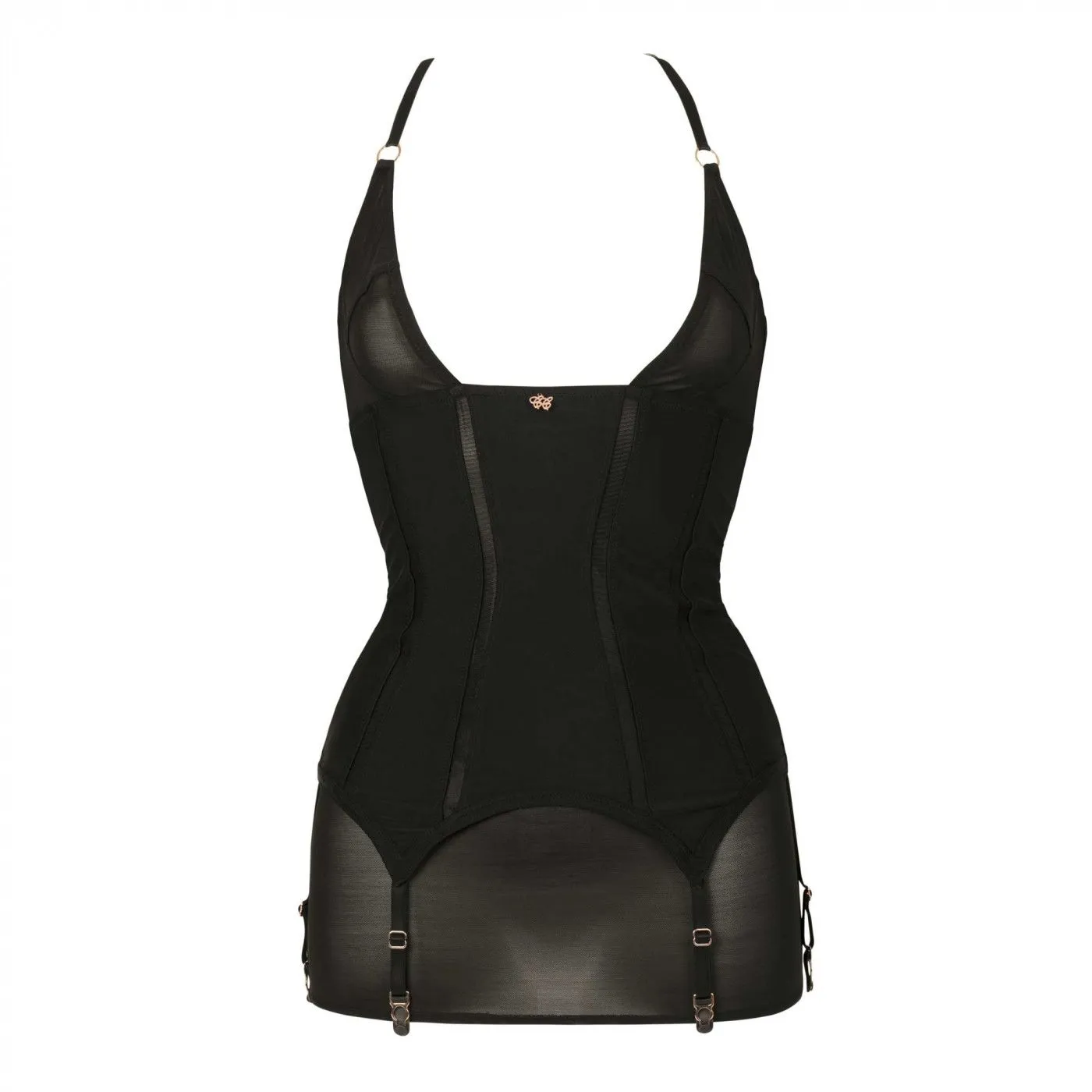 Cette guêpière est composée d’une première épaisseur en résille gainante, contre la peau qui forme une sous robe. Celle-ci est assemblée avec une deuxième épaisseur de tissu lycra opaque, alternée avec des bandes verticales en marquisette. Elle dévoile ainsi les courbes dans un délicat jeu de transparence. Ses attaches sont en acier couleur or rose, contrastant avec son tissu noir et appuyant son effet bijou.