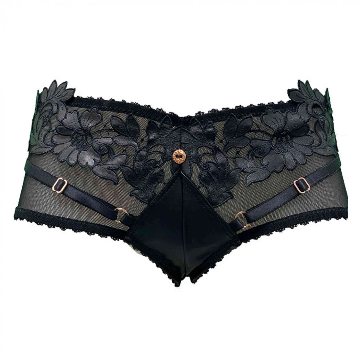 Ce shorty souligne les fesses avec sa coupe échancrée. La taille est parée d’une ceinture de fleurs en similicuir. Le creux des reins est orné de 3 boutons or-doré. Deux lanières élastiques satinées habillent les hanches et donnent un effet bondage à cette pièce de lingerie sensuelle. L’entrejambe est masquée par un triangle de similicuir, pour un effet habillé-déshabillé des plus élégants.