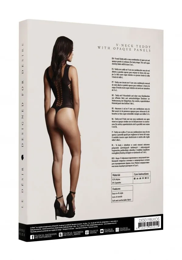Sa résille large sur l’avant dévoile un décolleté plongeant tandis qu’un tissu plus opaque marque les hanches.