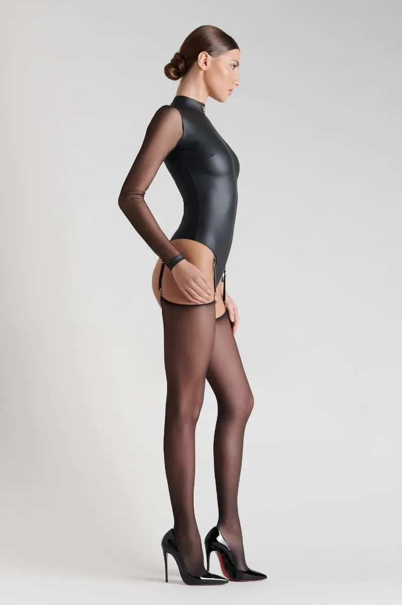 Le corps du body est composé d’une matière effet cuir qui, malgré son opacité, habille les courbes tout en légèreté. Le galbe du sein est ainsi souligné tout en délicatesse. Ses manches longues en tulle ultra doux dévoilent la peau en transparence. Son col montant est orné d’un anneau doré, signature de la collection, qui suggère l’attachement. Ses bras sont habillés de manchettes qui subliment le poignet dans un effet bijou. Sa coupe string met en valeur les fesses et allonge la jambe. Ses porte-jarretelles sont amovibles et réglables, permettant de porter le body avec des bas ou des jarretières au gré des envies.