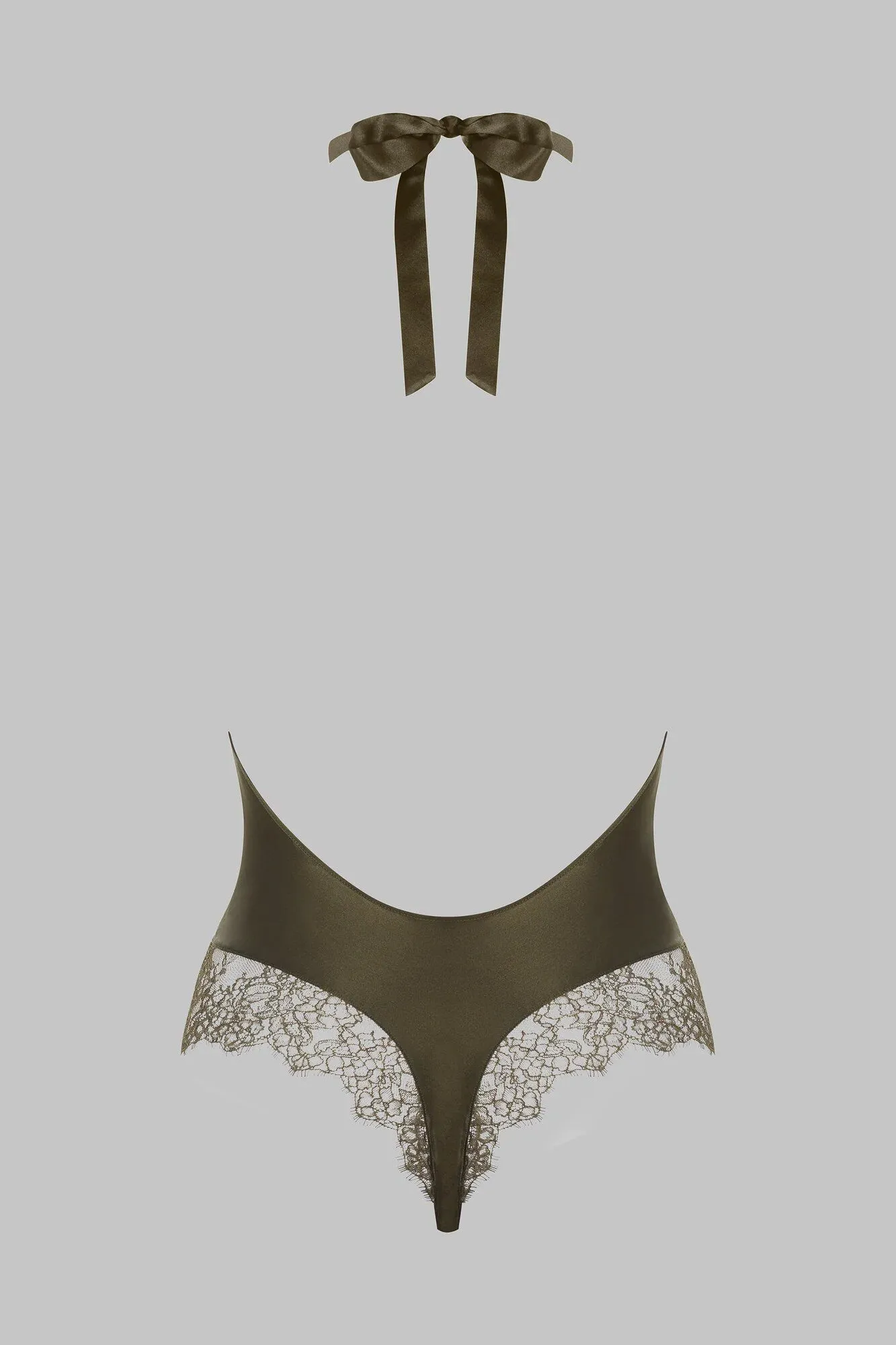 Ce body habille le buste d’une soie délicate. Sa coupe string échancré met en valeur le galbe naturel de la fesse. Une dentelle fine florale souligne les hanches avec élégance. Son encolure américaine laisse les épaules et le dos nu tout en relevant délicatement la poitrine. L’entrejambe n’a pas d’agrafe pour assurer un confort optimal et est protégée par une doublure en coton. Il se ferme sur la nuque par un long ruban en soie à nouer.