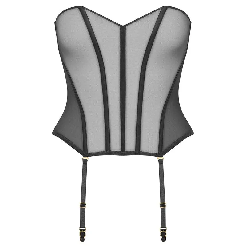 Ce corset porte-jarretelles est composé d’un tulle d’une transparence absolue.
