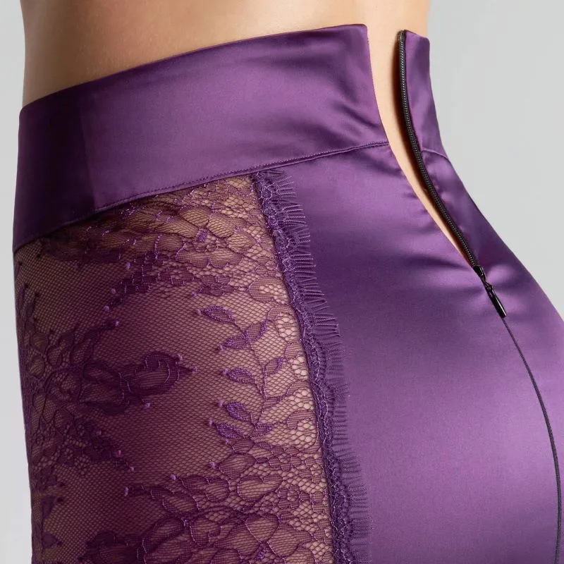 Savant mélange de satin et de dentelle florale, cette jupe habille la peau avec délicatesse. Ses matières douces et non élastiques sont faites pour sublimer les courbes. Sa dentelle fine habille les cuisses et les hanches d’un motif fleuri. D’une couleur violet foncé, elle se marie aisément avec vos parures de lingerie ou tenues du quotidien.