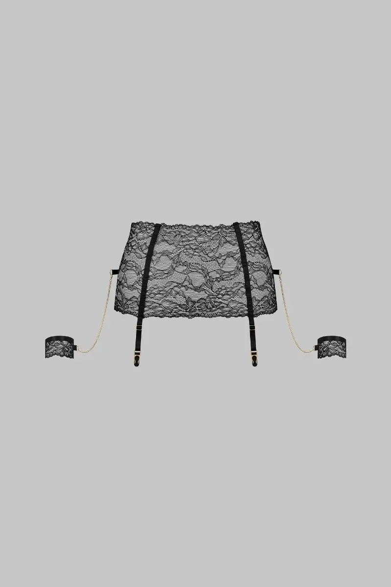 Pièce unique et signature Maison Close, le porte-jarretelles menottés Le Petit Secret Dentelle enrobe le corps de sa dentelle, dans une étreinte de douceur et de sensualité.