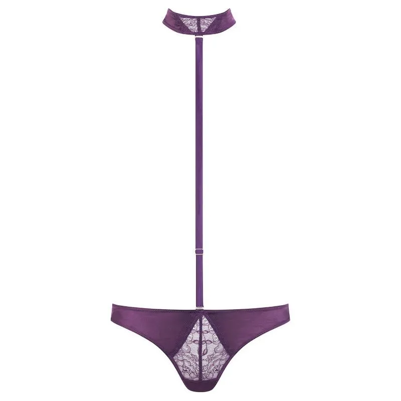En satin et dentelle florale, ce string habille le corps de matières qui caressent la peau. Un triangle de dentelle symétrique sublime l’avant du string et est rappelé sur le collier du harnais. Son satin violet foncé se marie a parfaitement avec ses attaches dorées. Dans un esprit romantique, ce string met en valeur la silhouette.