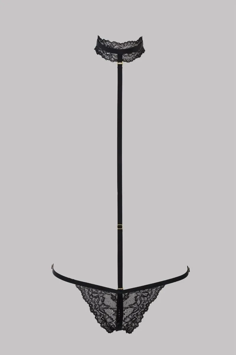 Cet ensemble combine un string ouvrable par des petits boutons noirs et un harnais amovible avec un col en dentelle ajustable.