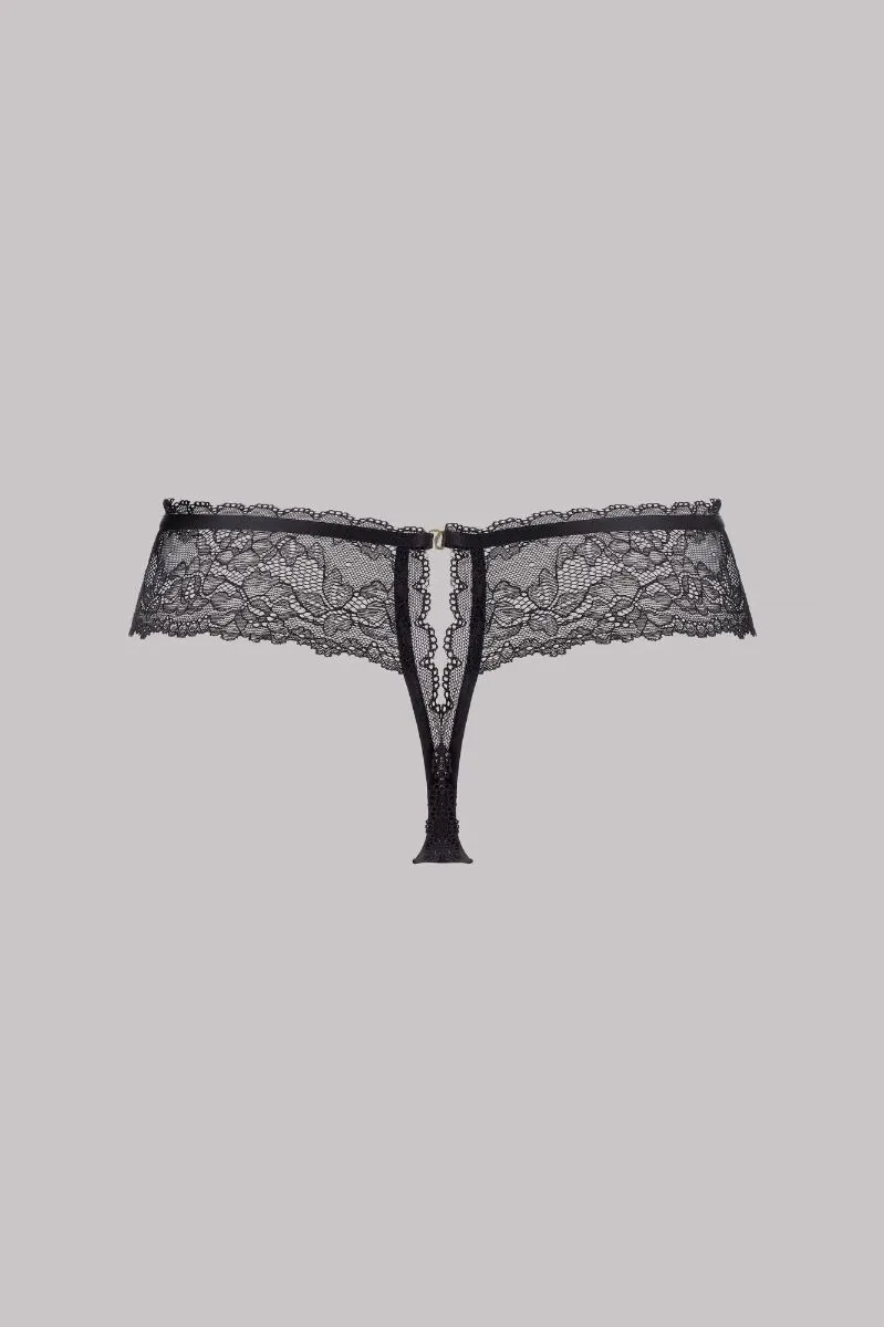 Tout en dentelle et assorti d’accessoires de couleur or, ce string tanga s’ouvre sur le haut des fesses par un système de fermeture Ă agrafes.