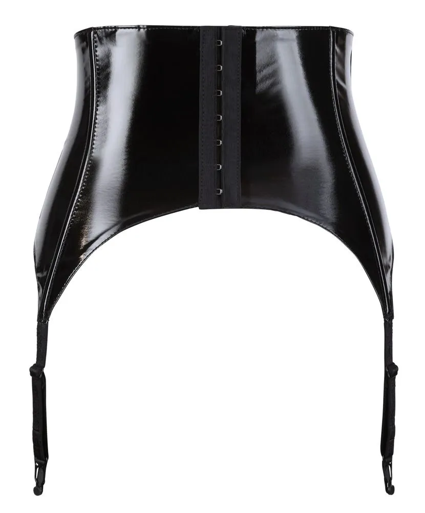 Ce porte-jarretelles large est en vinyle brillant et orné de boucles sur l’avant.