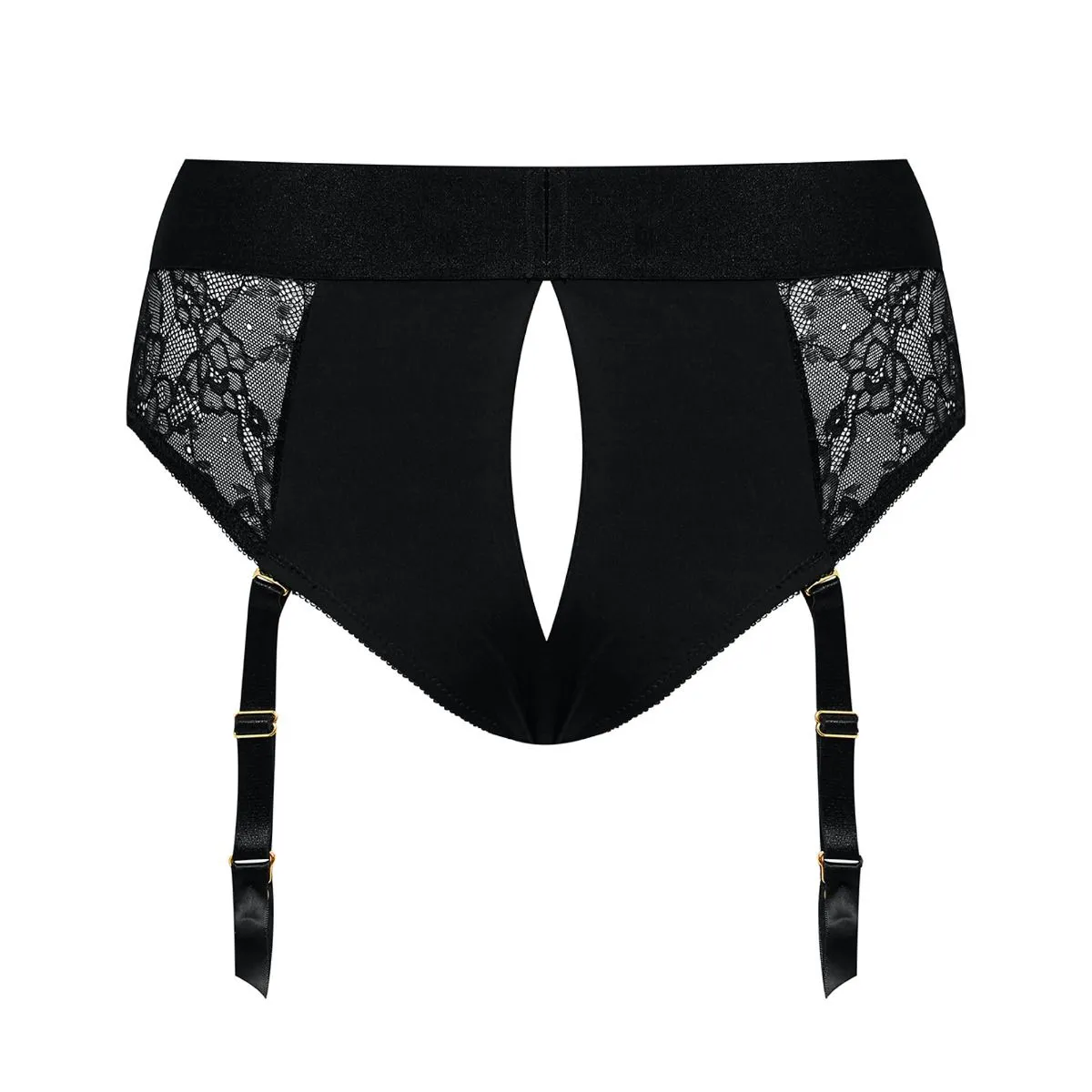 Sous forme de boxer, il est agrémenté de dentelle et de porte-jarretelles, sans oublier sa très jolie ouverture sur les fesses.